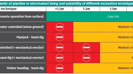 While noting that pipejacks and microtunnels are now routinely installed at up to 3.4m internal diameter (i.d.), the tables focus on three colour-coded risk levels (low, medium, and ‘not acceptable’) across five bands of diameter: less than 1.2m; 1.2m; 1.5m; 1.8m; and, more than 1.8m.