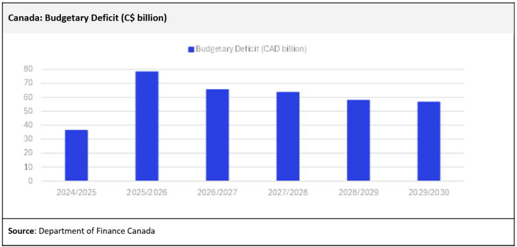 In November 2025, Canada’s 2025-2026 federal budget was delivered by the Minister of Finance and National Revenue François-Philippe Champagne, under Prime Minister Mark Carney. The 2025-2026 federal budget titled ‘’Canada Strong’’, lays out C$280bn ($205.1bn) in spending over the next five years. The new budget also showed a deficit of C$78.3bn ($57.4bn) for 2025-2026, which is projected to decrease to C$65bn ($47.6bn) in 2026-27, C$64bn ($46.9bn) in 2027-2028, C$58bn ($42.5bn) in 2028-29, and C$56.6bn ($41.5bn) in 2029-2030. Canada’s 2025-26 budget deficit increased significantly owing to heightened spending on defence, infrastructure, and housing sectors, alongside weaker economic growth forecasts, particularly impacted by the US trade tariffs and the ongoing global uncertainties.