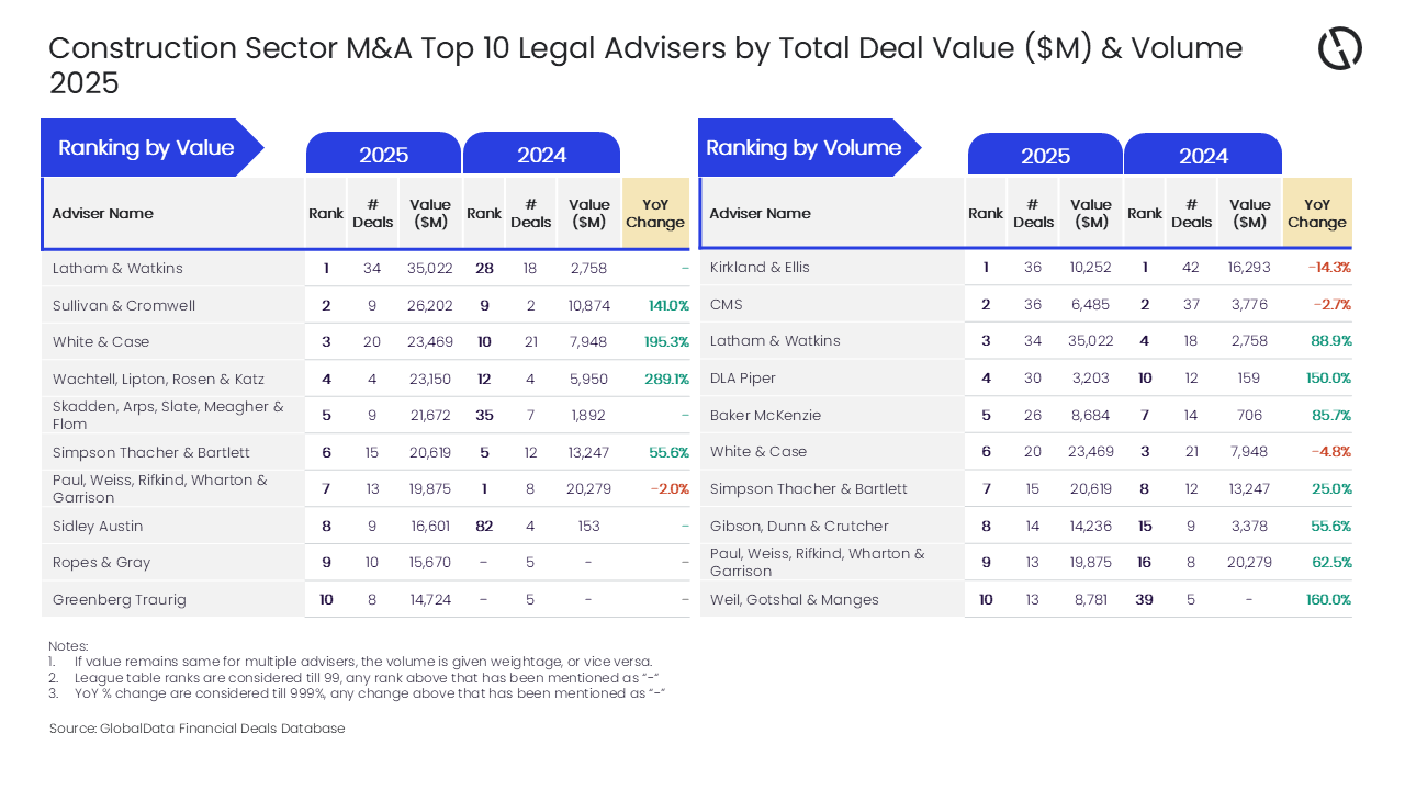 Latham & Watkins, Kirkland & Ellis lead 2025 M&A legal advisers in construction sector