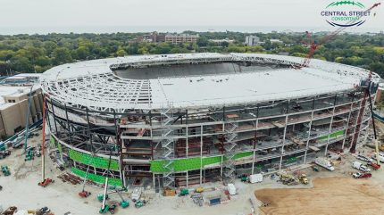 The construction milestone follows the placement of the final steel beam that signals the completion of the stadium’s structural phase.