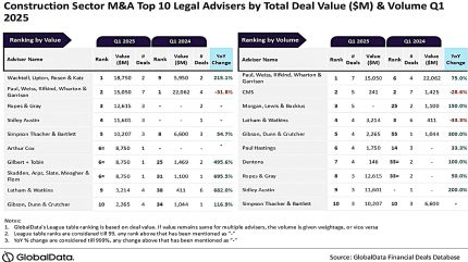 Wachtell, Lipton, Rosen & Katz; and Paul, Weiss, Rifkind, Wharton & Garrison have topped the legal advisers rankings for mergers and acquisitions (M&As) in the construction sector by value and volume, respectively, in the first quarter (Q1) of 2025, according to the latest league table released by GlobalData.
