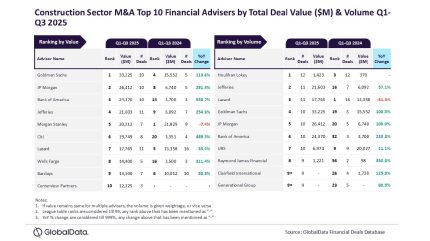 Goldman Sachs has ranked first by deal value and Houlihan Lokey by deal volume among financial advisers for mergers and acquisitions (M&A) in the construction sector during the first three quarters of 2025, according to research from GlobalData.