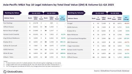 Paul Hastings and TriLegal have emerged as the leading mergers and acquisitions (M&A) legal advisers in the Asia-Pacific region for the first three quarters (Q1-Q3) of 2025, according to the latest legal advisers league table released by data and analytics firm GlobalData.