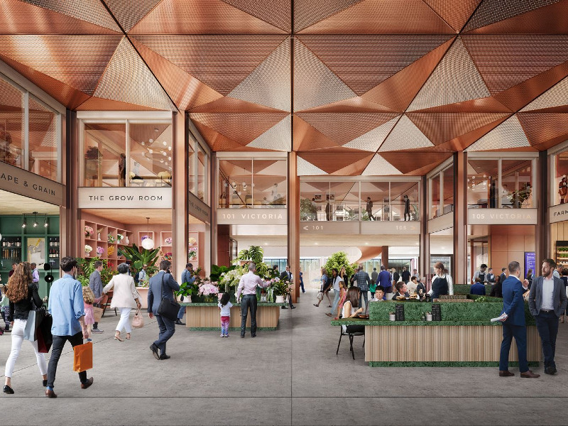 The public plaza on the ground floor is known as Village Square, which is designed as an extension of the Victoria Street pavement. The floor will also include two office entrances, with elevators as well as retail space.