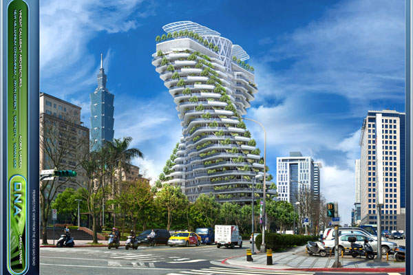 Successive floors are twisted 4.5° clockwise and connected at both ends by two spiralling mega-columns coated in green walls. The double helix tower twists 90° in total from base to tip, rendering it a moving geometry that appears to morph in shape depending from which direction it is viewed. Its north-south elevation gives it a reverse pyramid shape, while its east-west elevation is shaped like a rhomboidal pyramid.