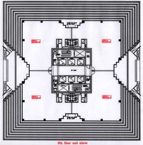 A stationary concrete pump pumped concrete both to the core wall and the surrounding floor on alternate days, thereby achieving a floor cycle of two days per floor. Steel columns of 10.5m in height for three floors were erected with supporting floor beams abutting the central core wall at one end. The steel columns were encased in concrete and the exposed steel beams coated with a fireproofing spray agent that gives a fire rating of two to four hours.